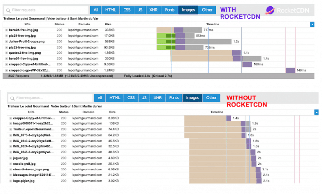 In the example below, the test site has an origin server in Paris. We compared the load time from Vancouver, Canada to see what difference Rocket CDN would make. On average, images loaded much faster with RocketCDN activated:
